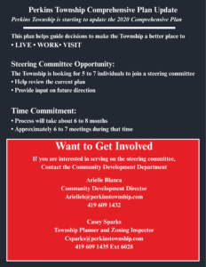 Perkins Township is seeking individuals that would like to join a steering committee to help review the current Comprehensive Plan and provide input on future direction. This process will take about six to eight months, with approximately six to seven meetings during that time. Want to get involved?