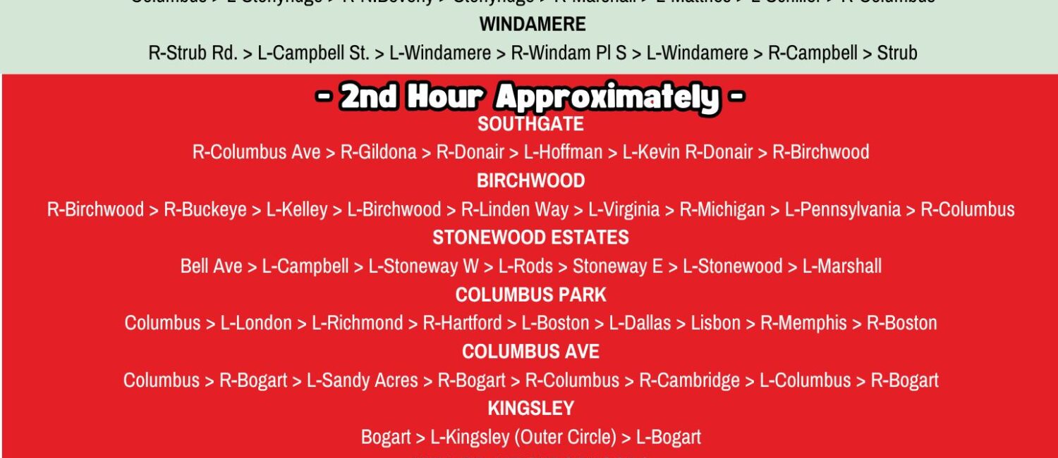 While we would love to be able to drive down every street and neighborhood in the Township, it is not possible. Please be mindful of the direction of the parade route. Some streets that are listed may not entirely be part of the route. If you have any questions, please reach out to us!